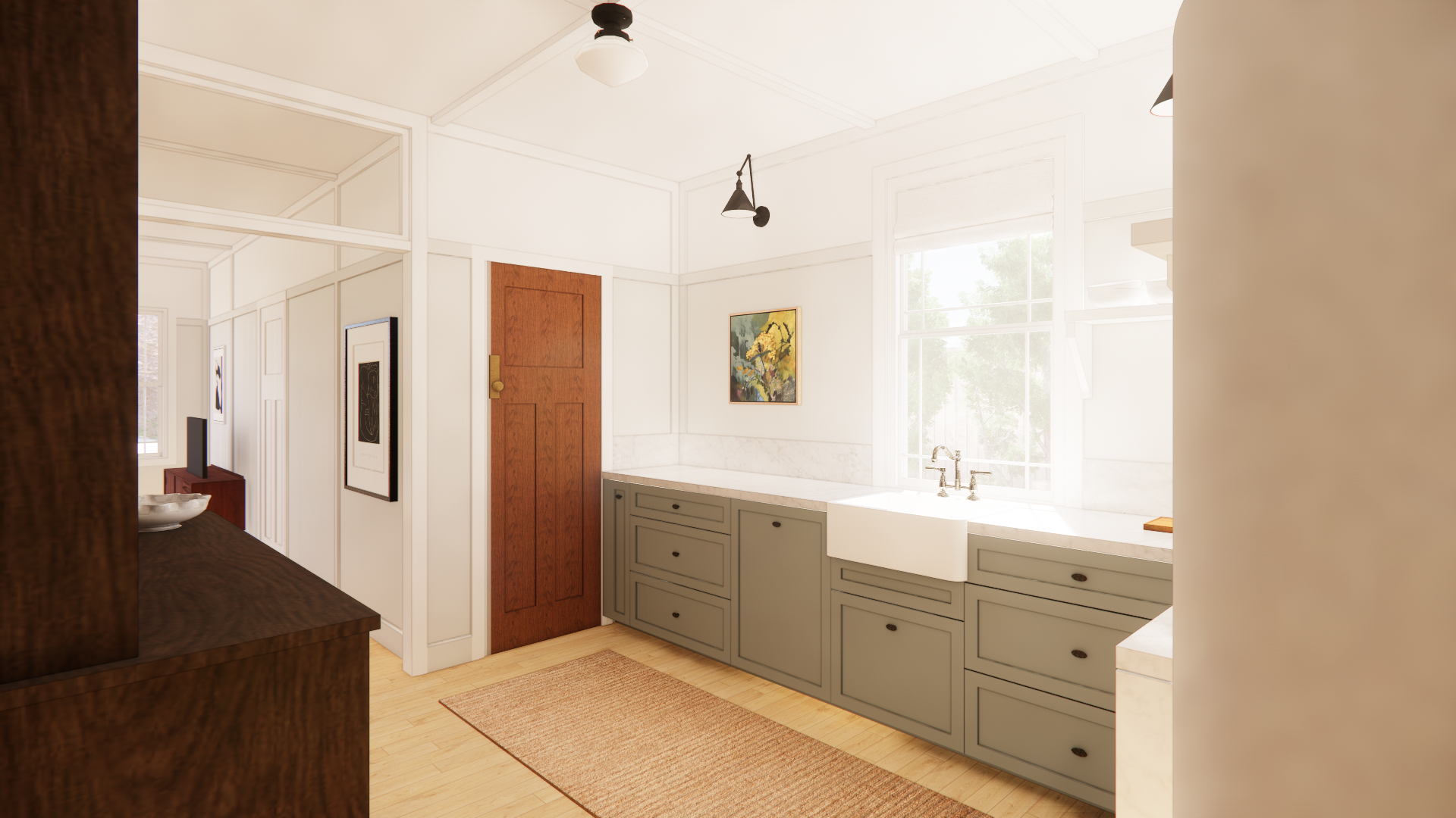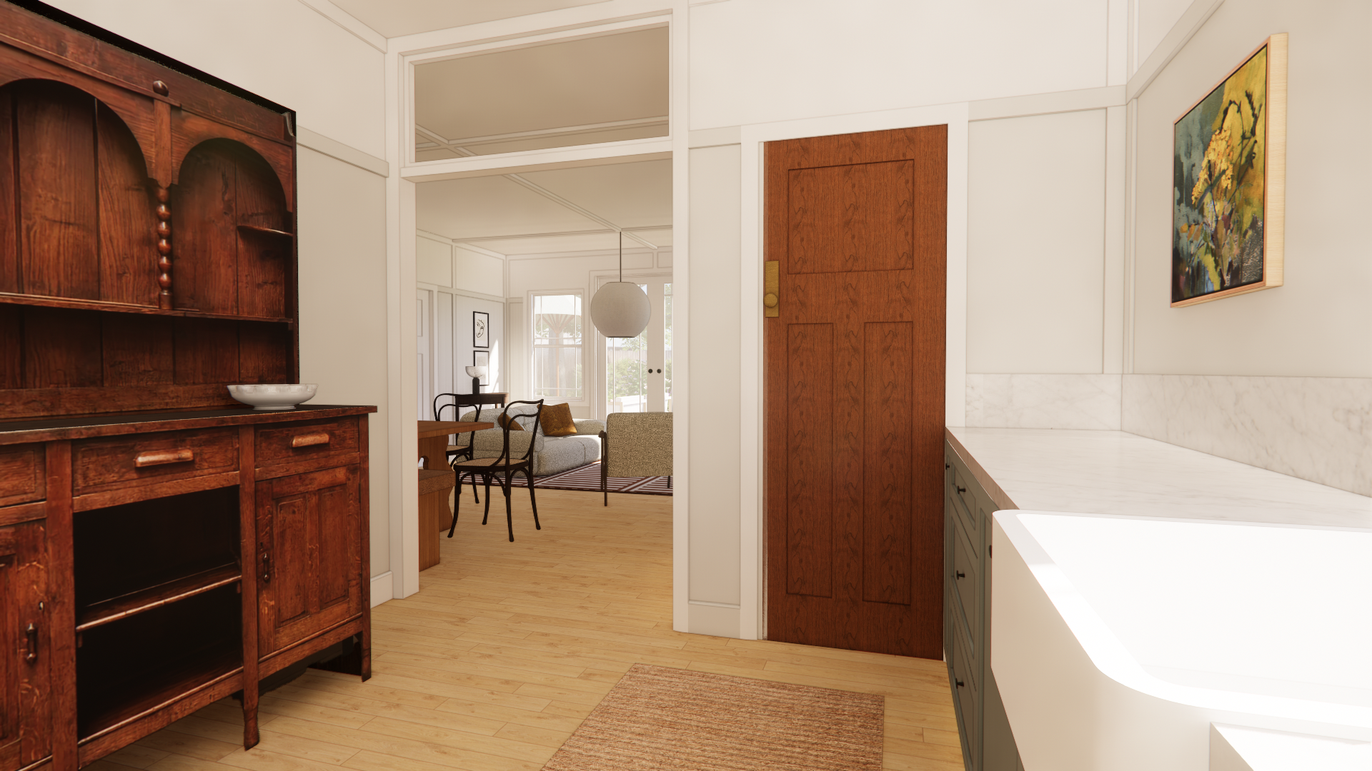 The clients, a family with two middle grade children, wished to retain the original layout and distinctive historical details—including a sympathetic 1990s rear extension—while updating the kitchen, main bathroom, powder room, and converting the laundry into a second bathroom. STUDIO TABLEAU produced detailed concept designs for each space, including floor plans and renders that sensitively respond to the home’s historical character and the clients’ love for more traditional style interior schemes as well as mid century design.